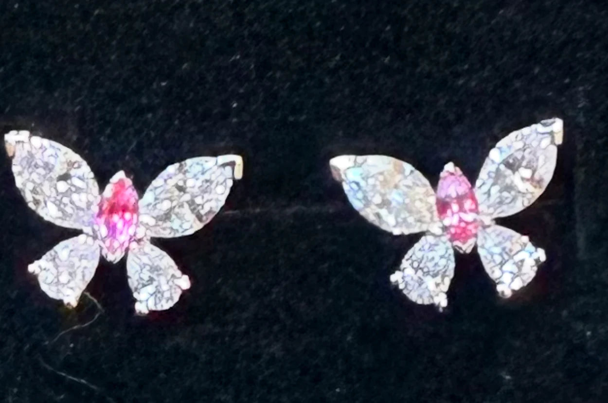 Butterfly studs made from natural diamonds and pink sapphires. 15% of proceeds will benefit Penny's Flight